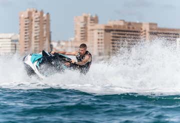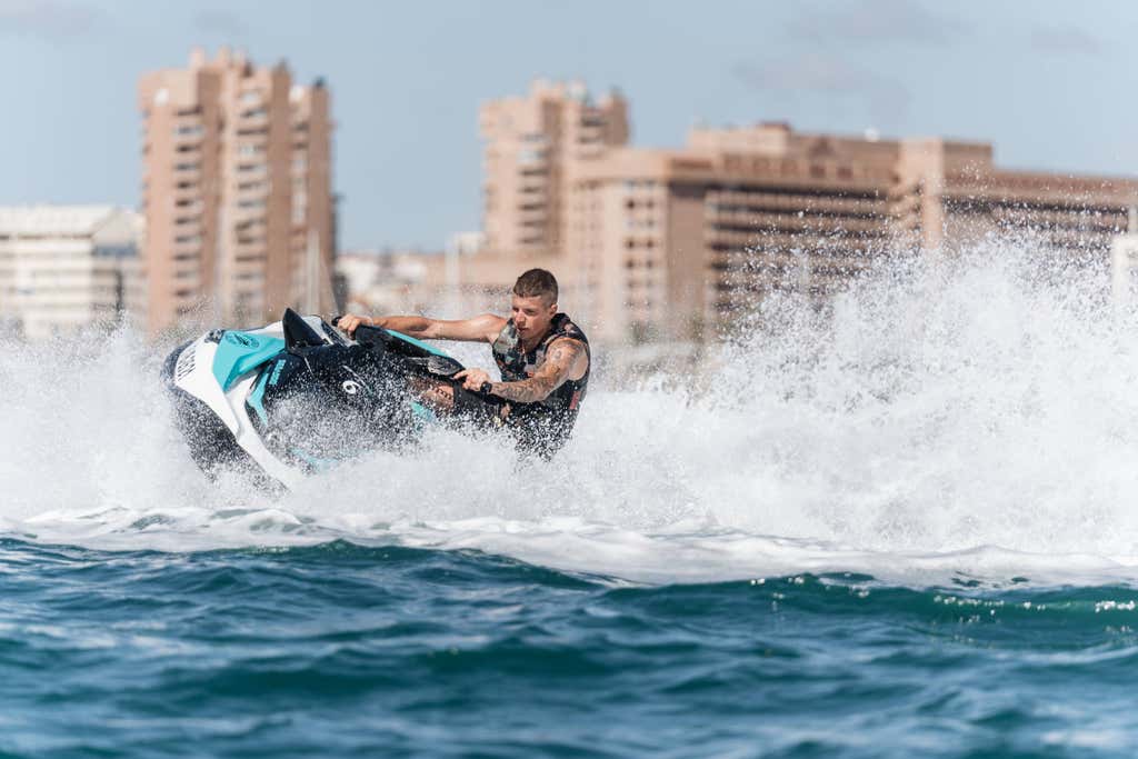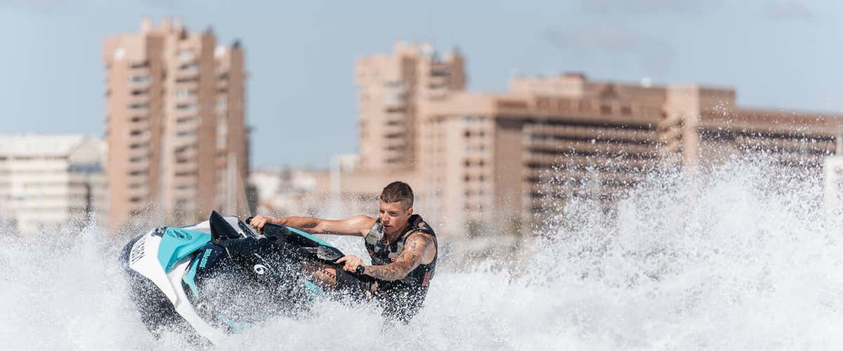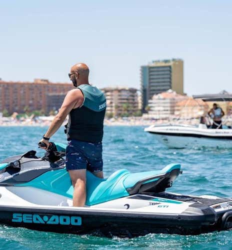 Alquila una moto de agua Sea-Doo GTX PRO de última generación y explora Fuengirola a tu ritmo. Recibirás instrucciones previas de un monitor experto y disfrutarás libremente de tu tiempo en el mar, sin necesidad de licencia. Ideal para principiantes.