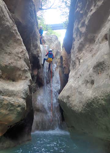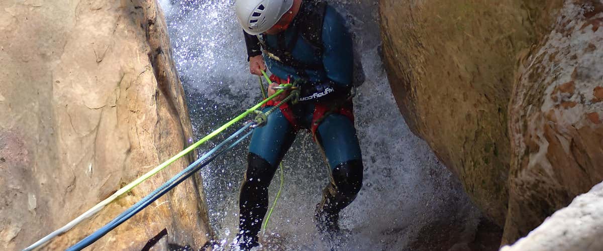 El acceso al interior del barranco lo haremos mediante un rápel: los más aventureros podrán descender 18 metros; pero si no quieres empezar así de fuerte, también podrás elegir una alternativa de tan solo 7 metros.