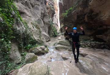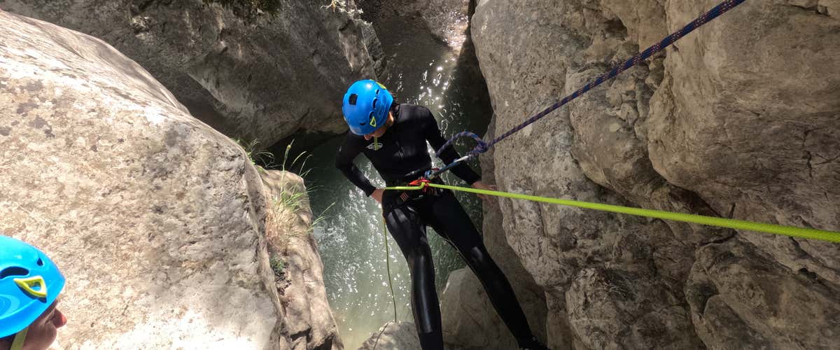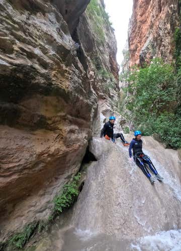 Prepárate para una experiencia de barranquismo intensa y salvaje de unas 3 horas en el Congost de Collegats: rápeles de hasta 20 metros, toboganes naturales, paredes imponentes y una cueva misteriosa que da nombre al barranco.