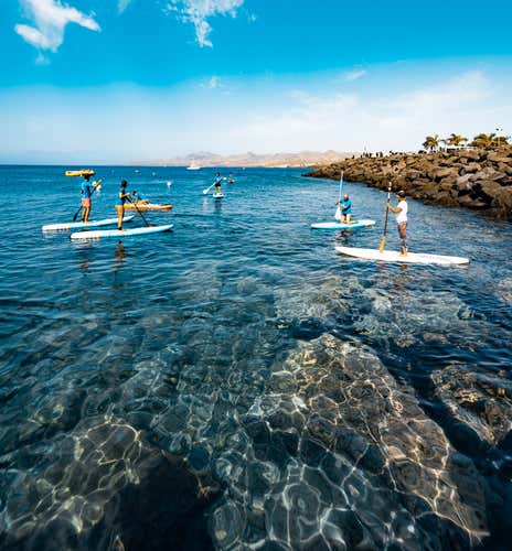 Una vez listos, entraremos al agua para empezar la práctica real. Según las condiciones del mar, la sesión se realizará en Playa Chica o en la bahía de Puerto del Carmen, dos lugares ideales para iniciarse en el paddle surf con total seguridad.