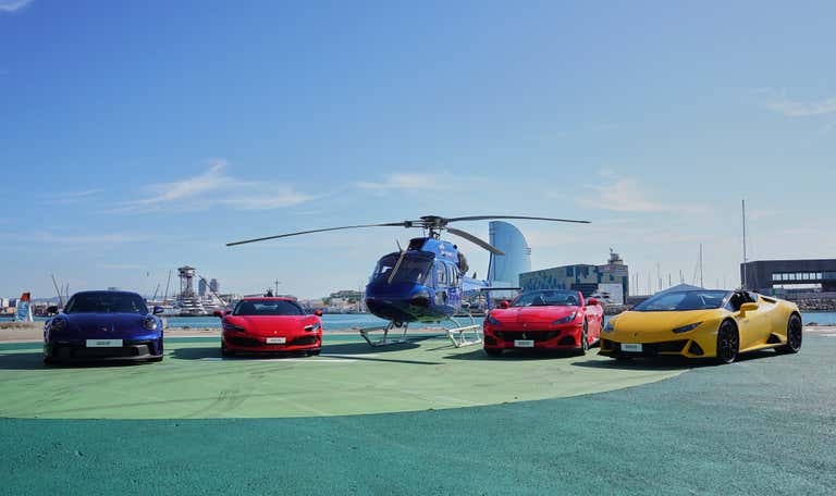 Conduce un superdeportivo durante 20 minutos por la costa de la Barceloneta y, justo después, despega en helicóptero para sobrevolar la ciudad a 300 metros de altura. Dos formas de descubrir Barcelona: una a ras del suelo y la otra desde las nubes.