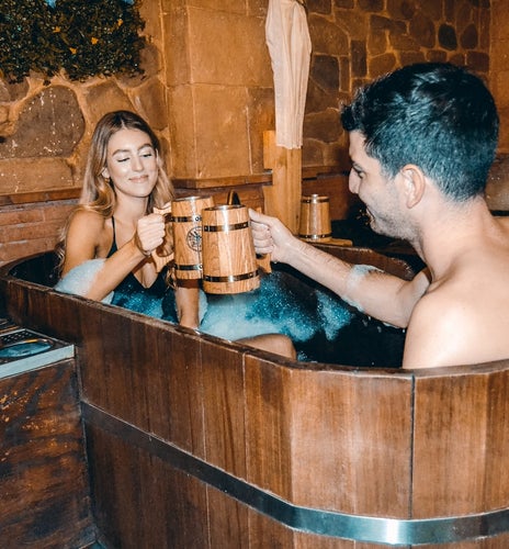 La experiencia arrancará con un baño de cerveza en un barril jacuzzi. Mientras las propiedades del lúpulo y la levadura actúan sobre vuestra piel, disfrutaréis de una degustación ilimitada de cerveza Alhambra y un aperitivo de cortesía. El circuito continuará en la sauna de cerveza y en una relajante cama de cebada, diseñada para que el descanso sea total.