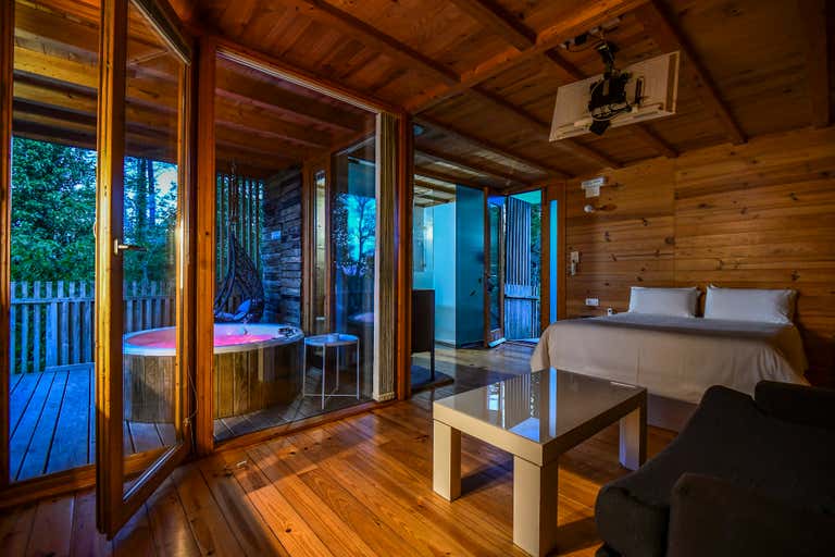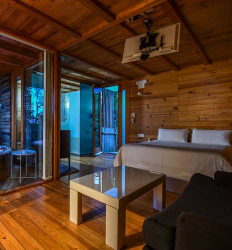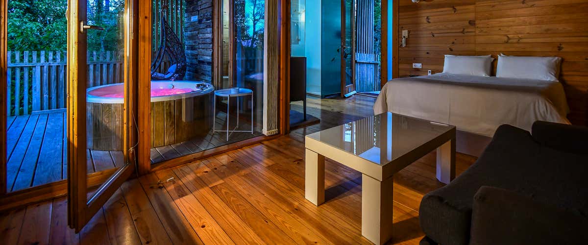 Una vez dentro, os alojaréis en una cabaña privada para 2 personas, diseñada para integrarse en el paisaje y ofrecer el máximo confort. En la mayoría de los alojamientos tendréis jacuzzi en el porche o en el interior para relajaros fundidos con la naturaleza. Cada finca tiene su propia esencia, pero todas incluyen una cama doble matrimonial, cocina completamente equipada, baño con ducha, toallas, productos de aseo, TV, Wi-Fi y climatización.