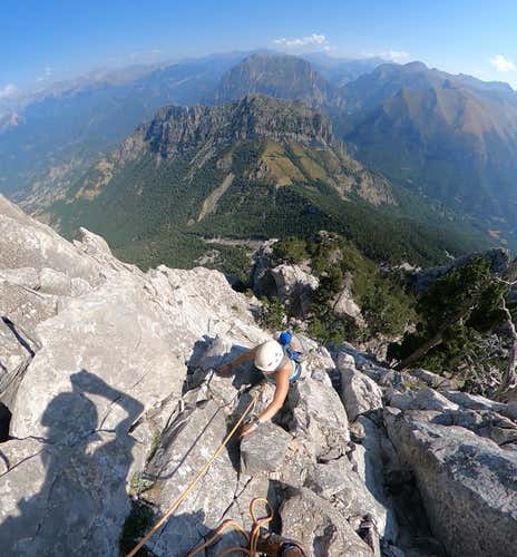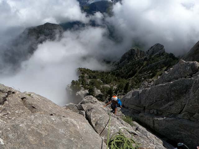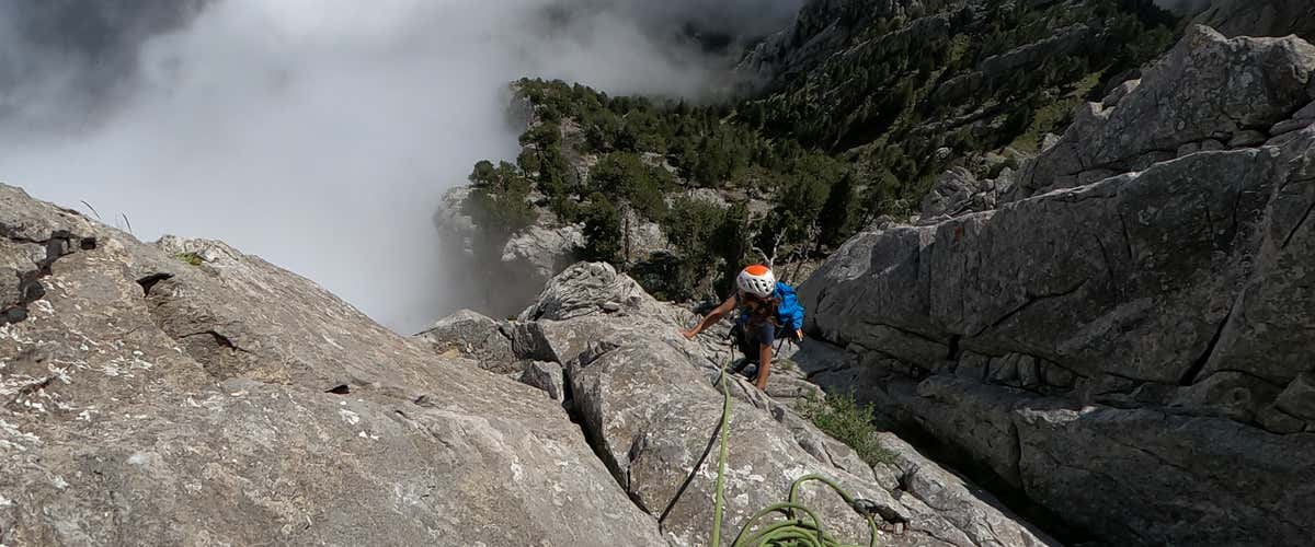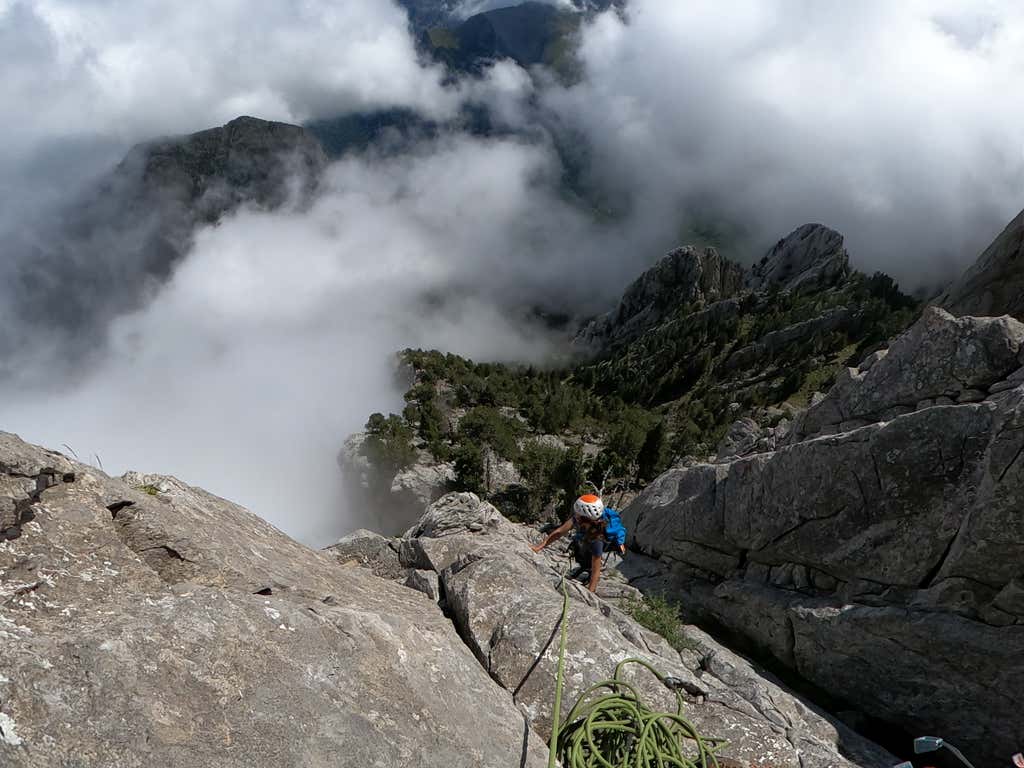 Durante la ascensión, avanzaremos por un terreno aéreo y panorámico, combinando tramos de arista con pequeñas secciones verticales de roca caliza compacta. Las vistas son espectaculares: desde aquí se divisan el macizo de Monte Perdido, Cotiella y Posets-Maladeta, una auténtica postal del Pirineo aragonés. A medida que ascendemos, el paisaje se abre en todas direcciones, y el ambiente se vuelve cada vez más épico.