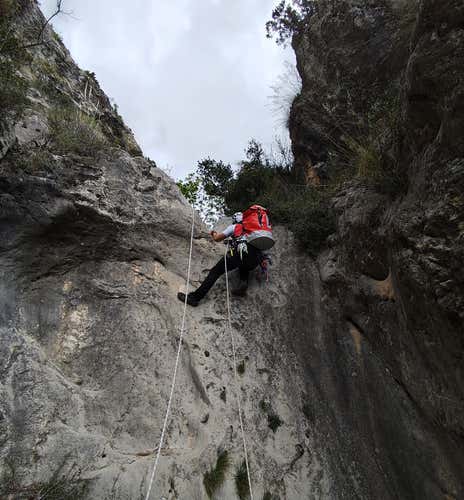 Desde la cima, daremos paso al descenso por el barranco de les Raboses. Tras algunas indicaciones del guía, cambiaremos de ritmo para iniciarnos en la técnica del rápel con total seguridad. Superaremos 8 descensos con cuerda encadenados, con alturas de hasta 10 metros. El barranco es sencillo, pero dinámico y muy divertido, ideal para empezar en el barranquismo disfrutándolo.