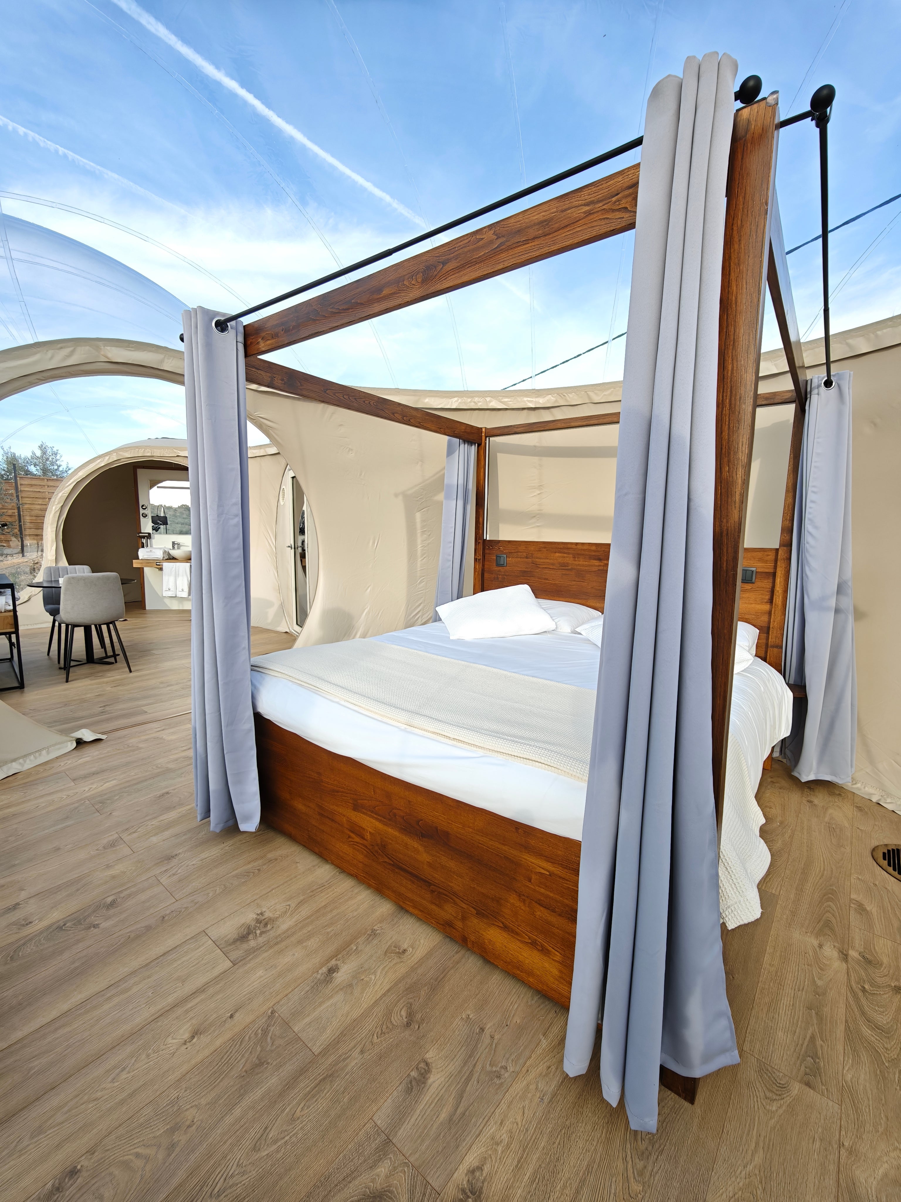 Una vez acomodados en vuestra burbuja climatizada —equipada con sala de estar y baño completo con ducha—, podréis sumergiros en vuestra bañera de hidromasaje privada. Es el lugar ideal para un baño relajante mientras el sol se oculta, regalando vistas panorámicas hacia la Sierra de Gredos en el horizonte. Además, para los amantes de la astronomía, cada suite dispone de un telescopio con instrucciones para explorar la luna y las constelaciones en la intimidad de vuestro propio jardín.