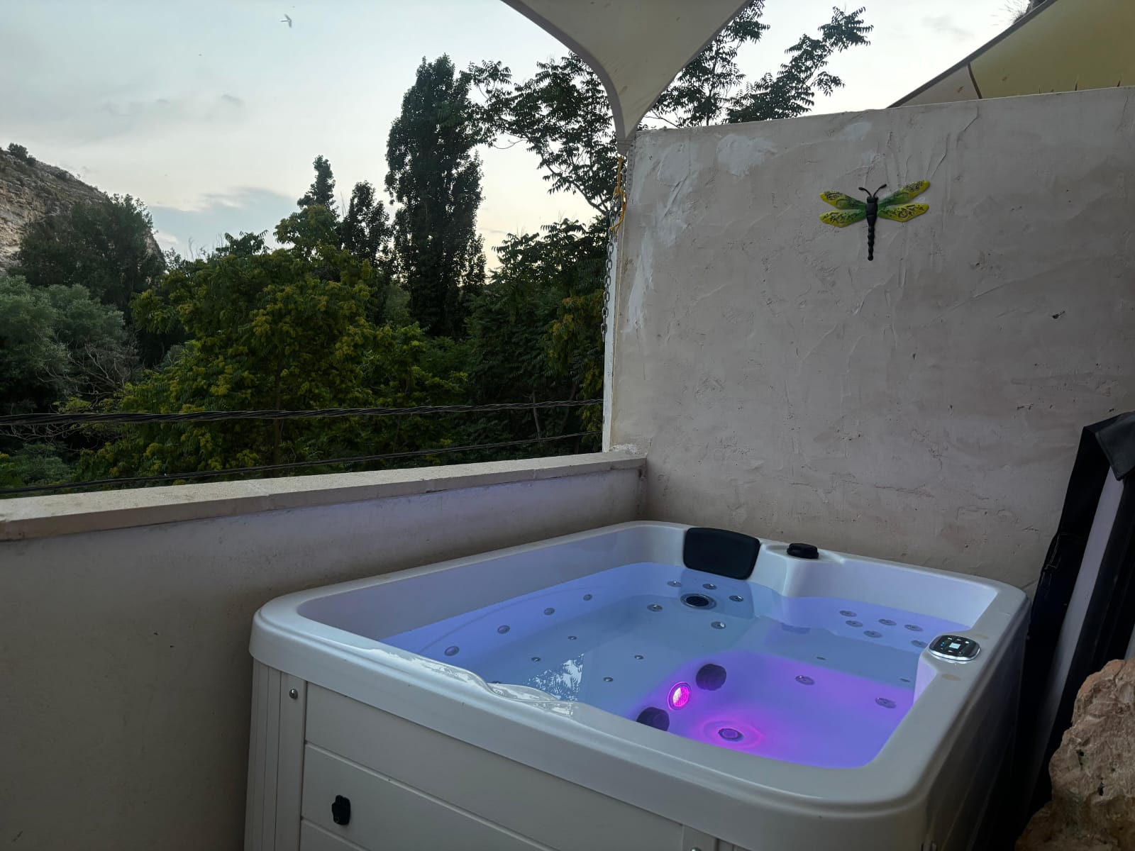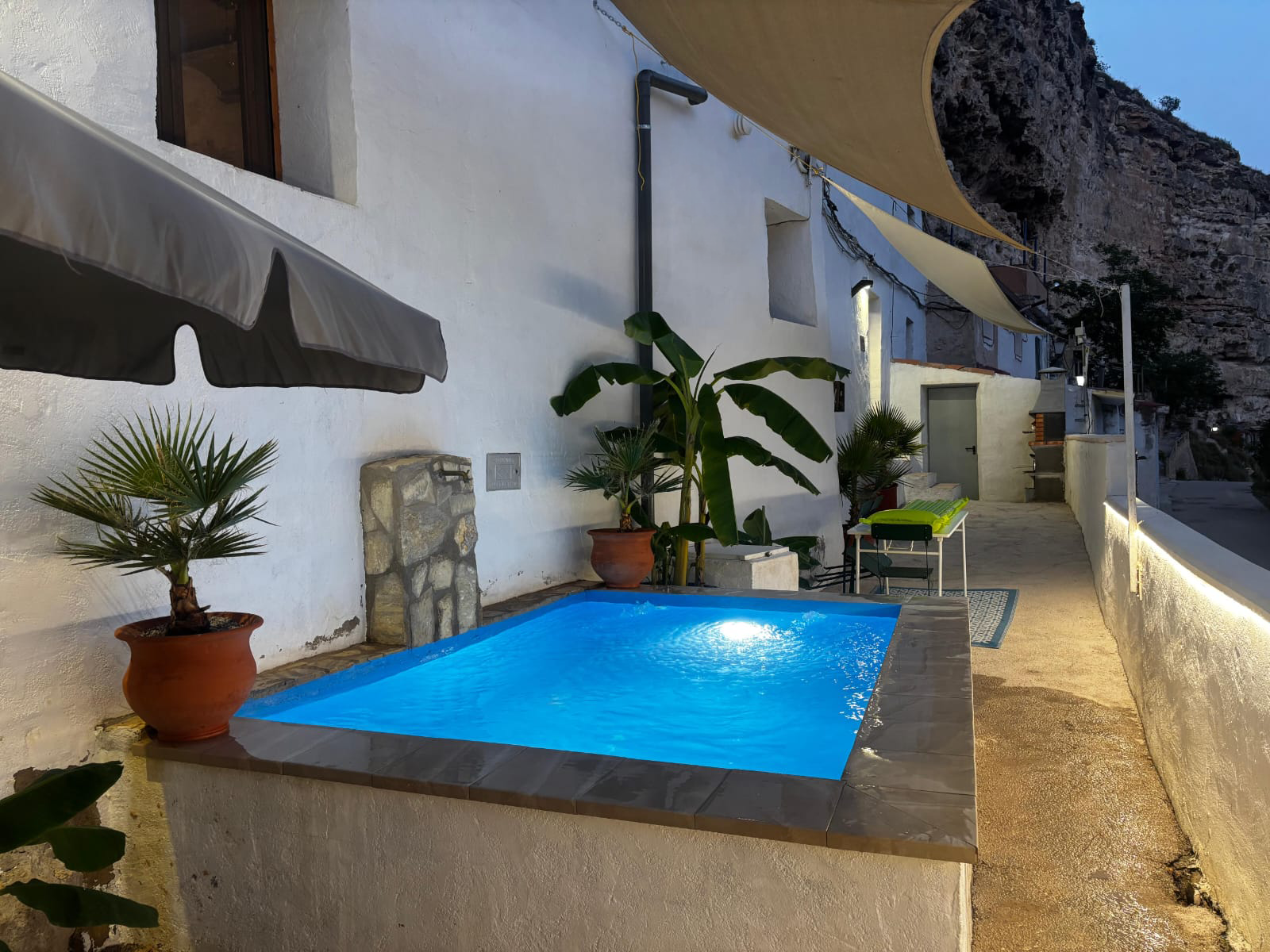 En el exterior os espera uno de los grandes protagonistas de la experiencia: vuestro jacuzzi privado, perfecto para relajaros mientras contempláis las vistas al cañón del río Júcar. También podréis disfrutar de la barbacoa y, en temporada, de la piscina compartida con la otra casa cueva.