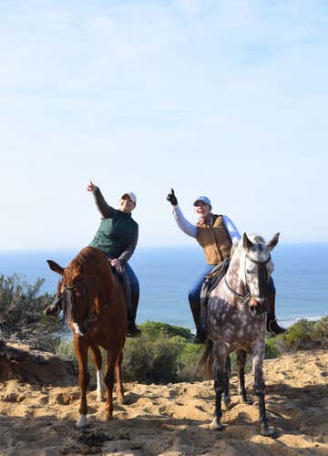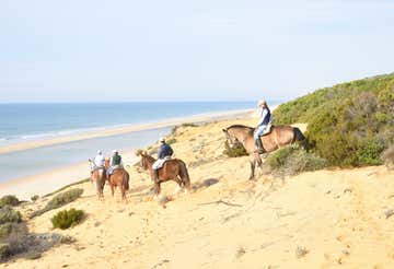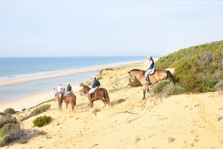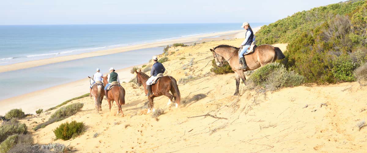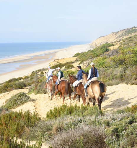 ¡Y ya estaremos listos para nuestro paseo a caballo! Nos adentraremos entre pinos y enebros, entraremos en el Parque Nacional de Doñana y continuaremos hasta llegar a la playa frente al Océano Atlántico. ¡Cabalgaremos por las dunas de arena de una de las cadenas dunares costeras más altas de Europa! El guía liderará al grupo a caballo y ofrecerá apoyo constante.