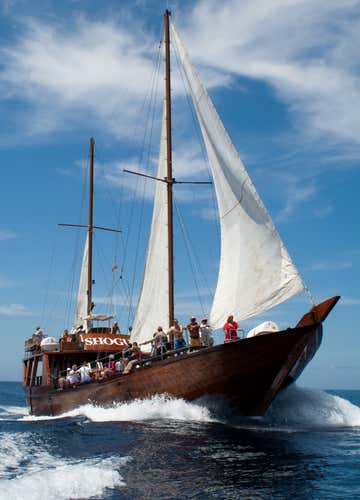 Navegarás en un barco árabe de 24 metros, con toldo, baños, escalerilla, y ducha.