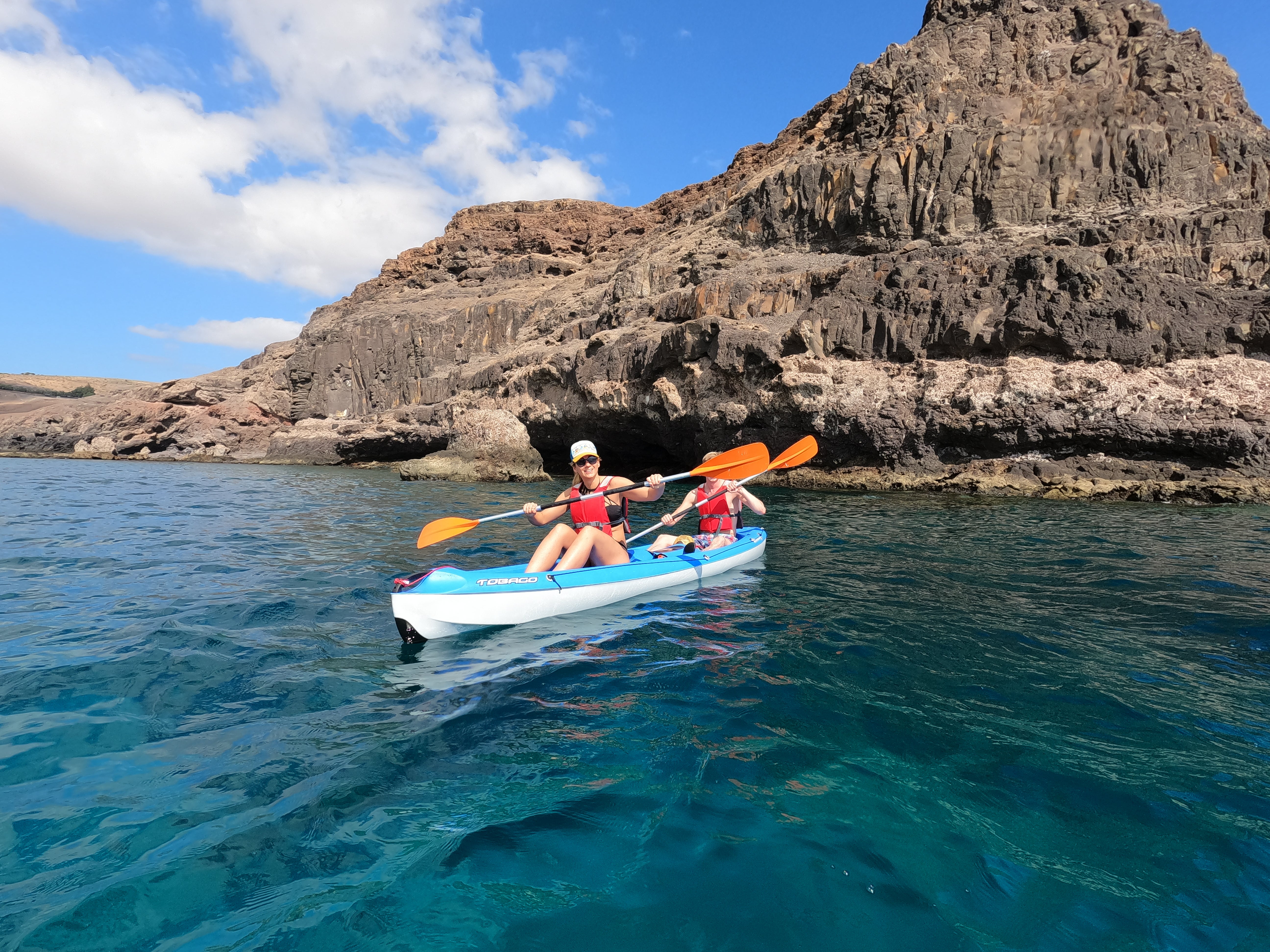 Nos veremos a la hora acordada en el punto de encuentro en la playa de La Lajita. Tras las breves presentaciones, recibiremos un pequeño briefing inicial para aprender a manejar el remo y coordinarnos en el kayak. No te preocupes si es tu primera vez; estos kayaks son muy estables y en pocos minutos estaremos navegando como si nada, sintiendo el primer contacto del agua fresca.