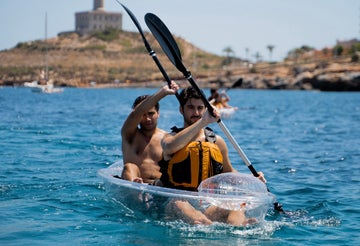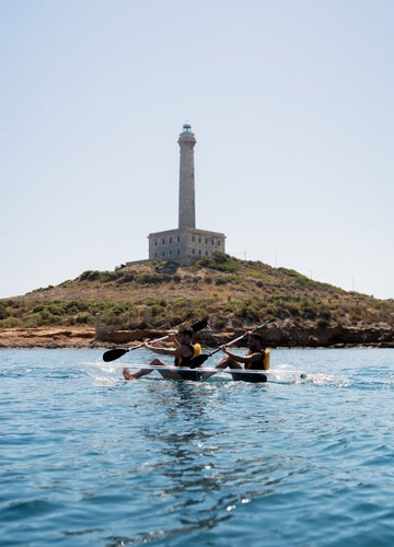 Después de prepararnos... ¡al agua! Subiremos a los kayaks y empezaremos a remar tranquilamente siguiendo la línea de la costa hacia el Faro de Cabo de Palos. Durante la travesía, pasaremos junto a formaciones rocosas tan curiosas como la Cala del Pato, mientras disfrutamos de la sensación única de ver el mundo submarino desplazarse directamente bajo nuestros pies gracias al casco transparente.