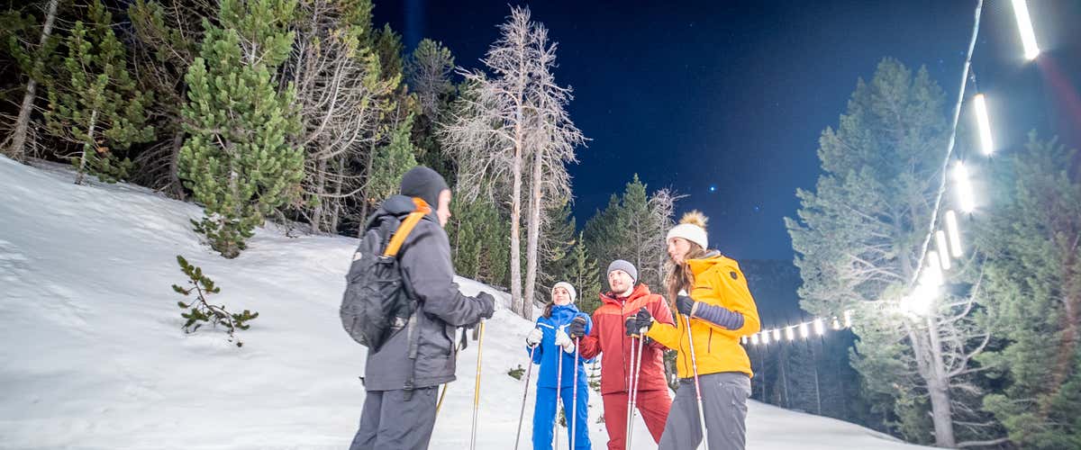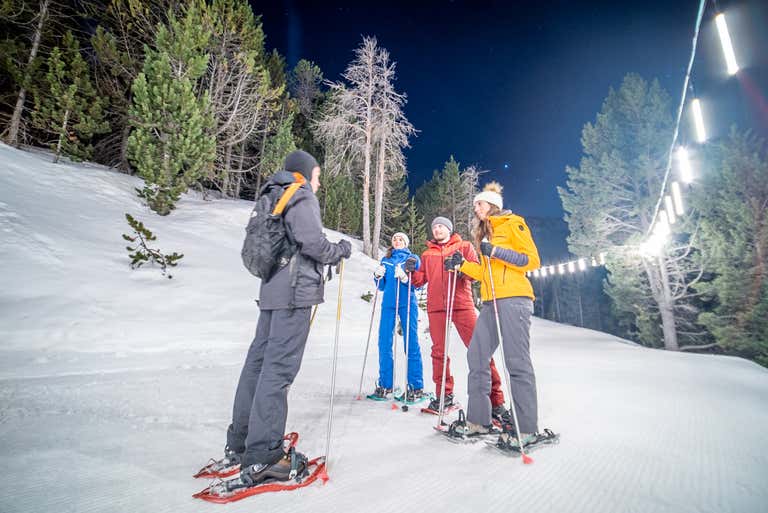 Vive esta ruta nocturna con raquetas de nieve en Grau Roig. Avanzarás paso a paso siguiendo al guía, cuando la montaña se queda en silencio y el paisaje se ilumina bajo las estrellas.