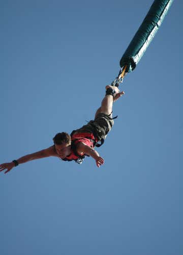 Una vez de vuelta en tierra firme, te prepararás para subir alto y vivir la emoción del bungee jumping, también con una duración aproximada de 20 segundos, pero esta vez con una caída libre desde 50 metros de altura. ¡Dos saltos, dos sensaciones totalmente diferentes!