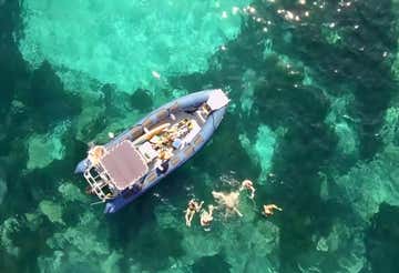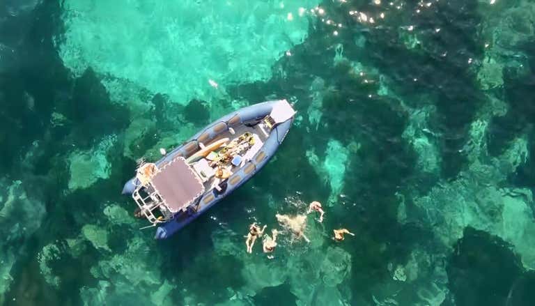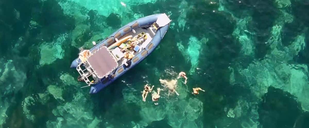 Navegarás en una lancha semirrígida de 12 plazas, modelo Valiant 750, con barandilla, toldo y escalera de baño. La lancha no tiene asientos, por lo que será necesario sentarse en los laterales de la embarcación.