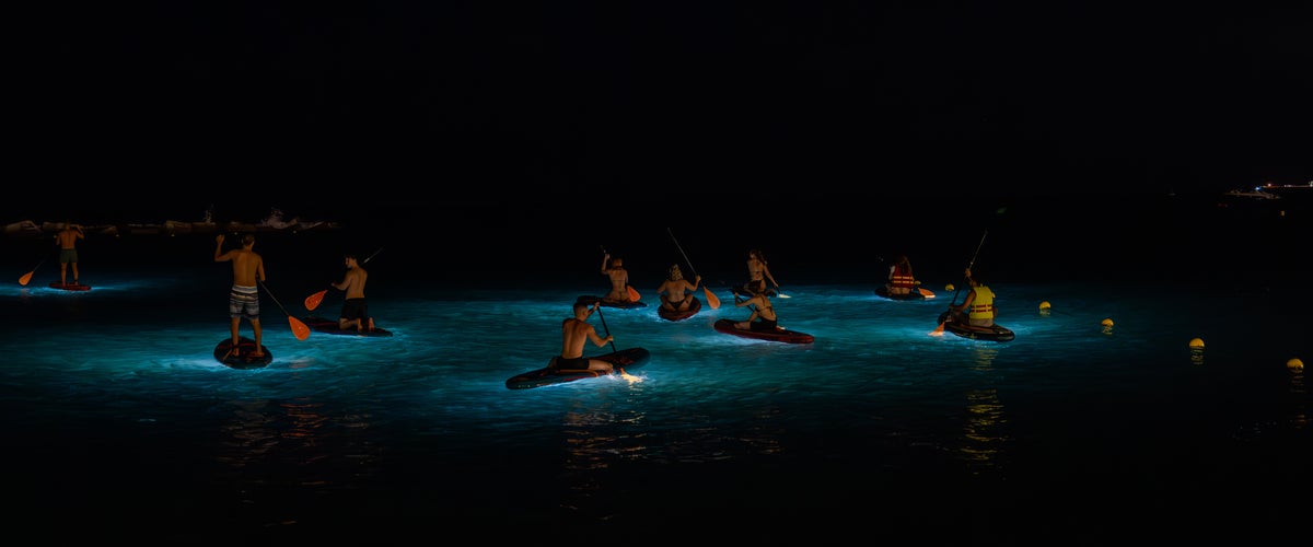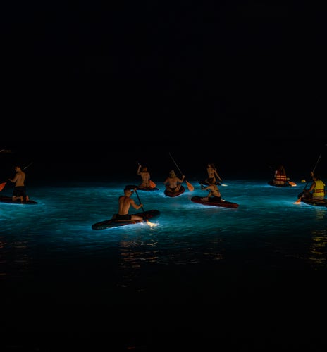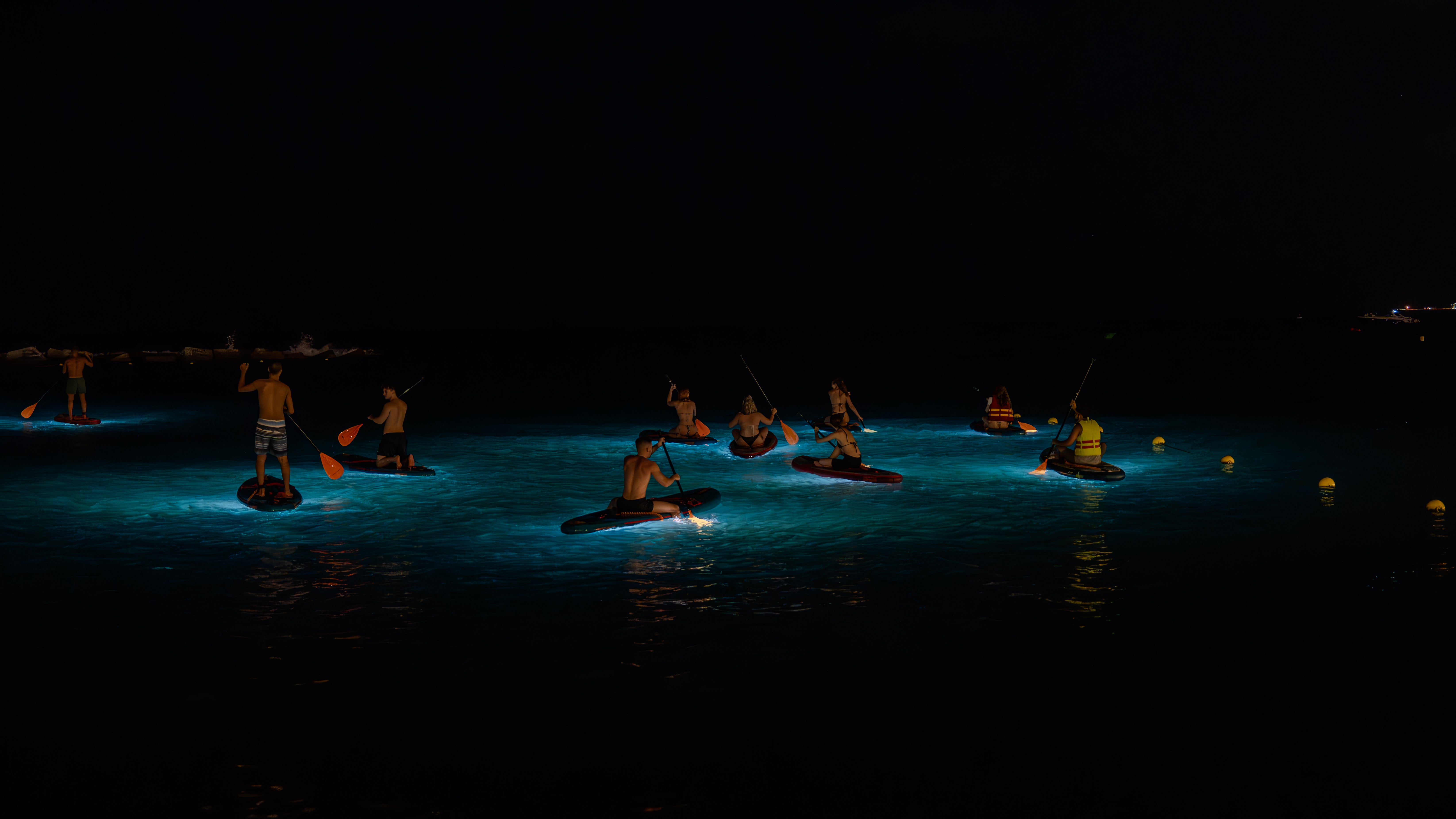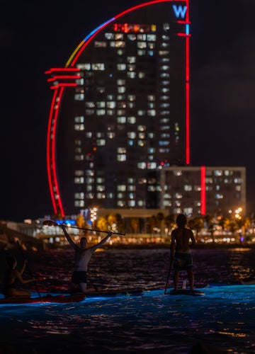 - Navega en tablas de SUP con iluminación LED submarina bajo el cielo nocturno de Barcelona