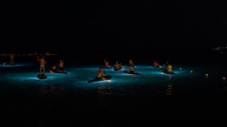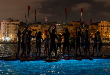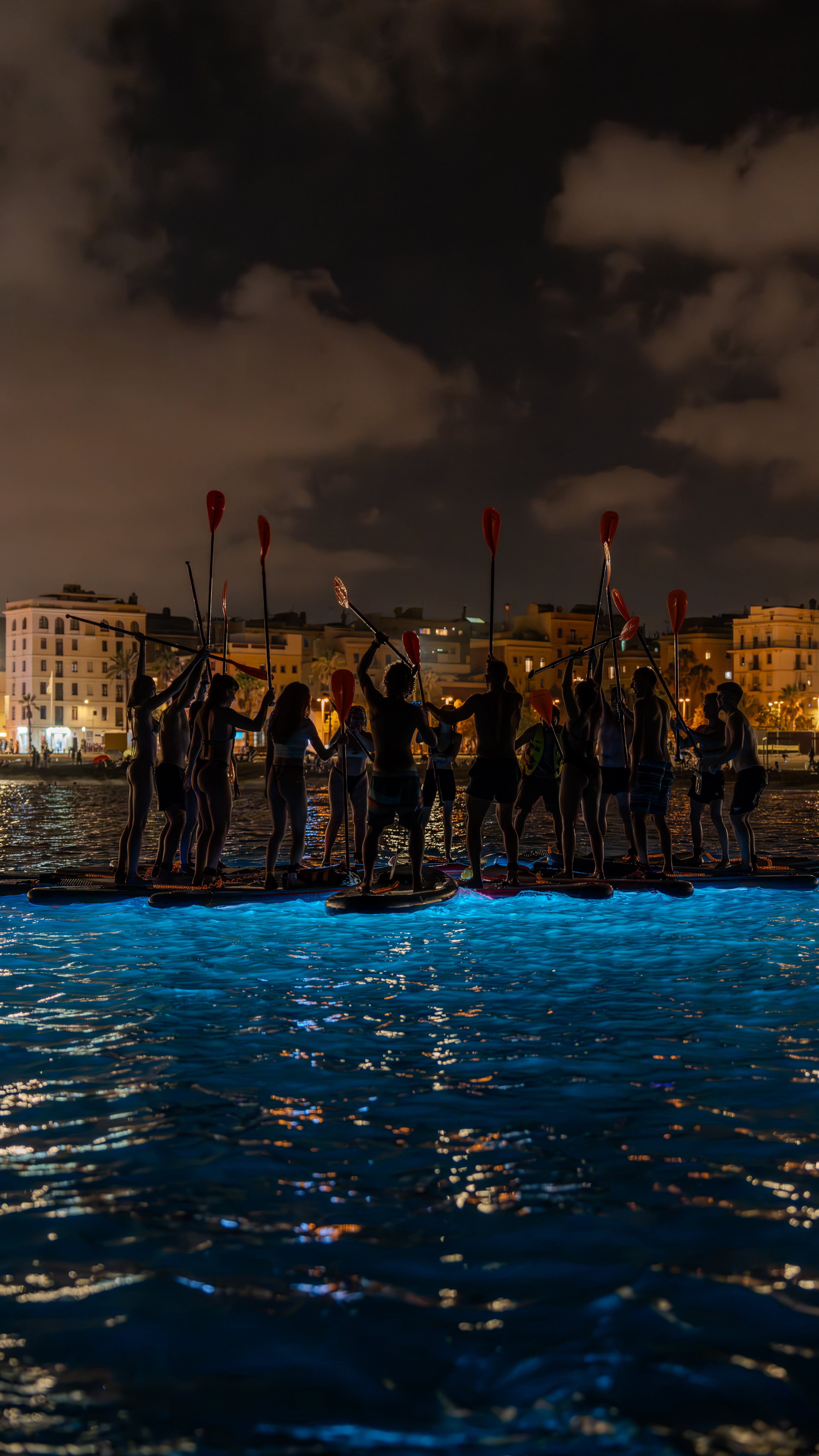 SUP nocturno bajo las estrellas con tablas iluminadas en Barcelona