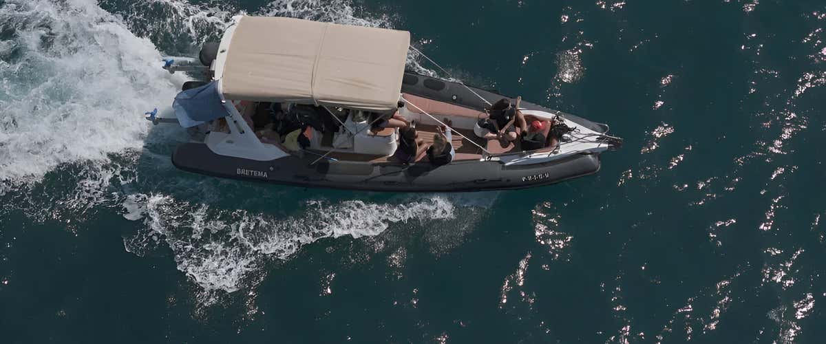 Subirás a bordo del Brétema, una lancha neumática de 8 metros de eslora. Se trata de una embarcación híbrida ecológica con hidrófono, binoculares y cámara para grabar vídeos submarinos.