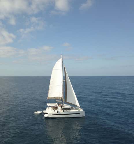 La embarcación es un catamarán modelo Bali 4.0, de 12 metros de eslora, equipado con salón panorámico, solárium con colchonetas, flybridge con colchonetas, amplio pozo con mesa central, baños, escalera para subir y bajar y sistema de audio Bluetooth.