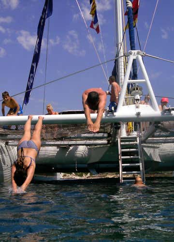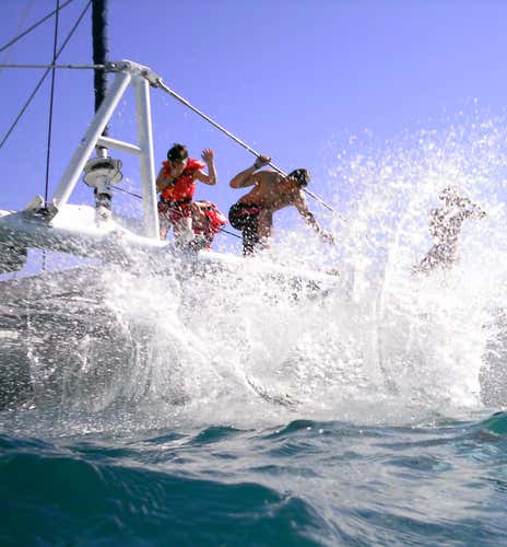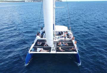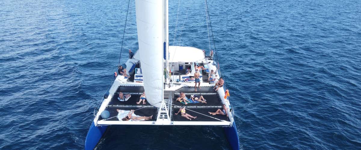 - Disfruta de barra libre de bebidas y relájate en el solárium del catamarán