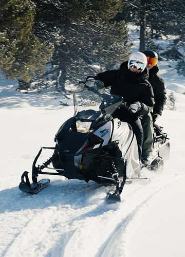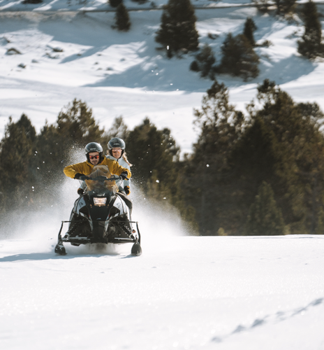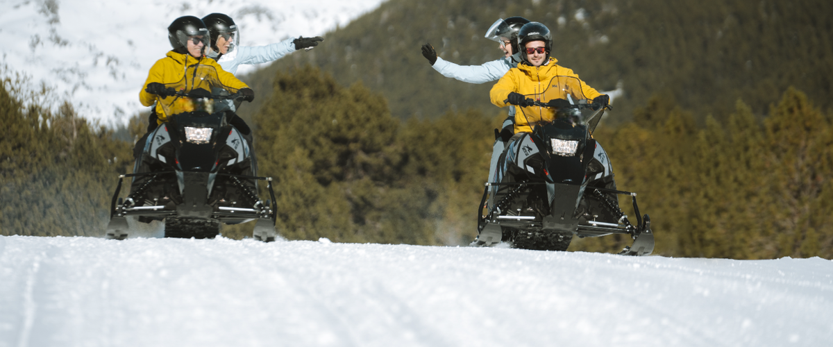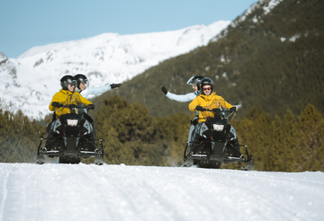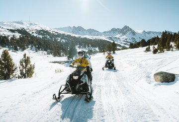 Conduce una moto de nieve por pistas blancas entre pinos y montañas en Grau Roig, siguiendo al guía a ritmo cómodo. Tú eliges la duración: 30 minutos, 1 hora o 2 horas.