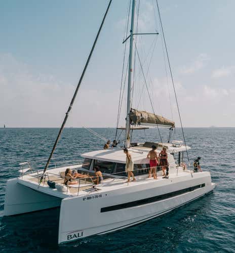 La actividad se realiza a bordo de un catamarán Bali 4.1, con longitud de 12,35 metros y capacidad máxima de 12 participantes. La embarcación está equipada con cocina, 2 cabinas dobles, 2 baños, una barbacoa exterior, altavoces con sistema bluetooth, sofá exterior en popa, lounge en el puente superior, solárium y toldo.