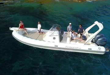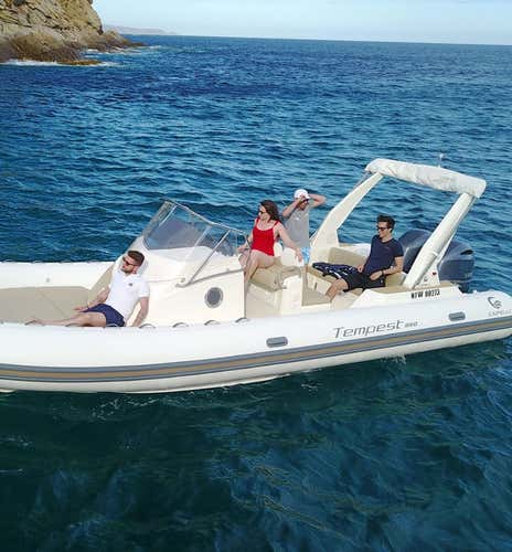 Navegarás a bordo de una lancha semirrígida Capelli 850 Tempest de 8,5 metros de eslora y con 2 motores Suzuki de 200 cv. La embarcación cuenta con toldo, solárium, cómodos asientos laterales y escalera para baño.