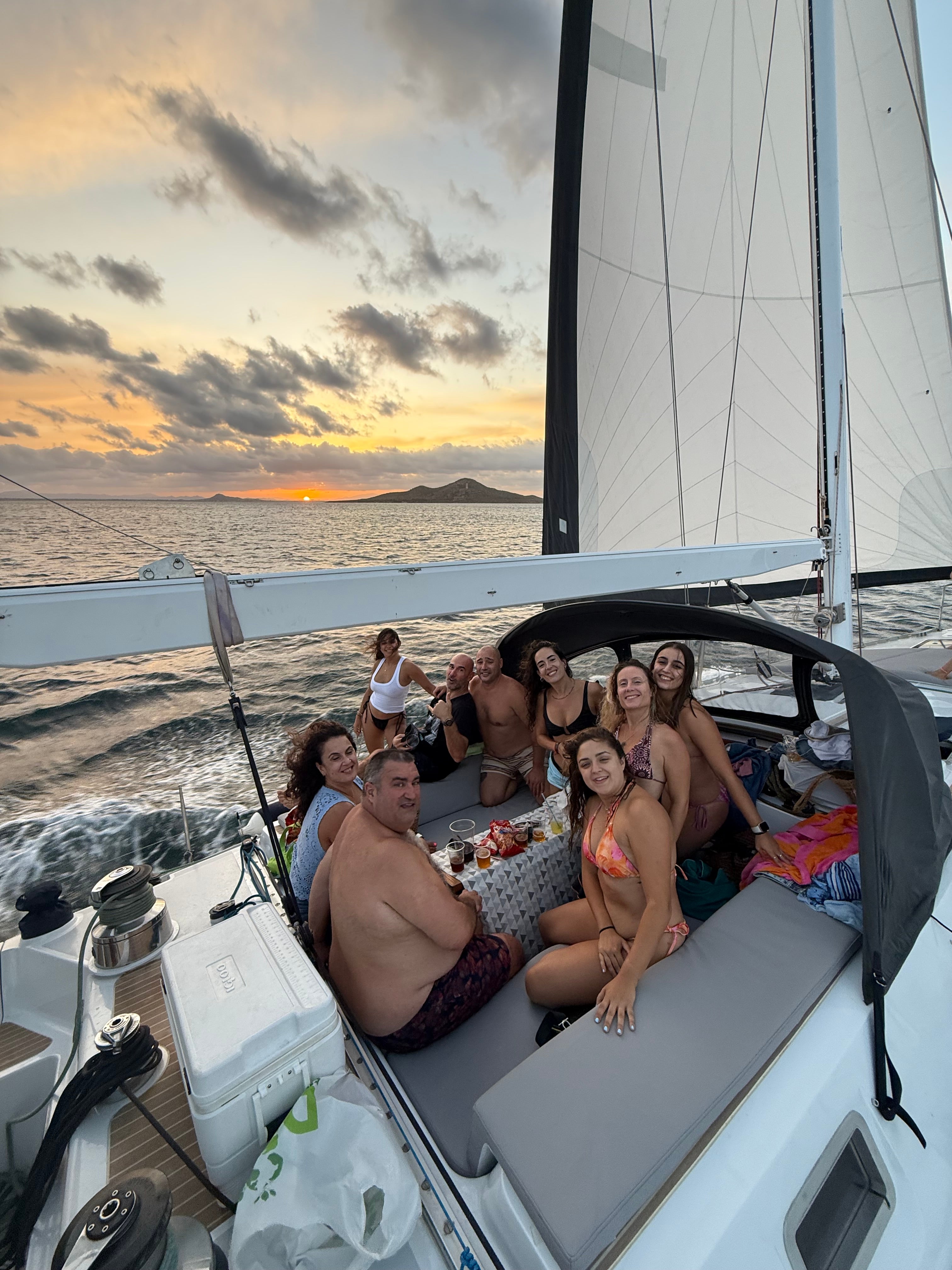 Disfrutaréis de tiempo exclusivo para relajaros en la proa o daros el último chapuzón del día. En cuanto el sol empiece a acercarse al horizonte, será el momento ideal para sacar vuestras bebidas y aperitivos y brindar bajo la luz dorada de la puesta de sol murciana.