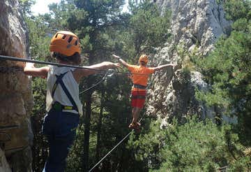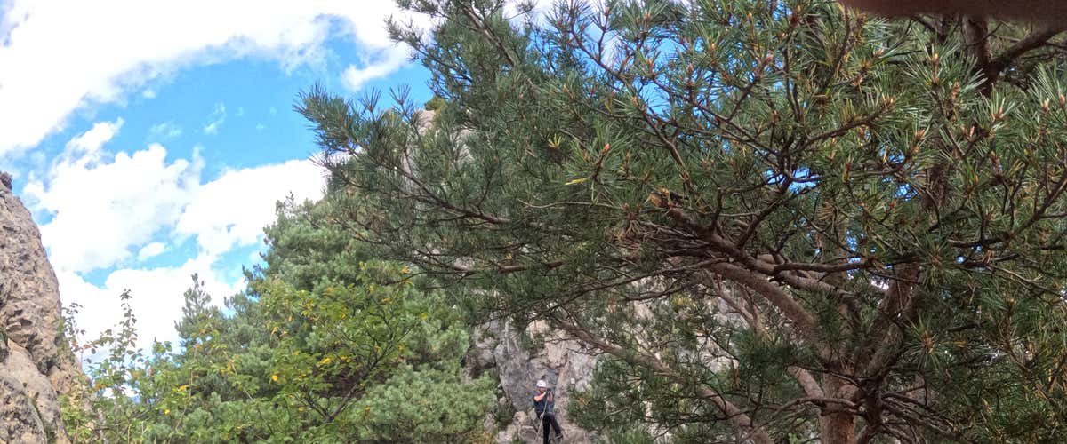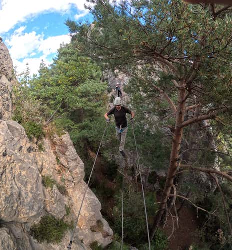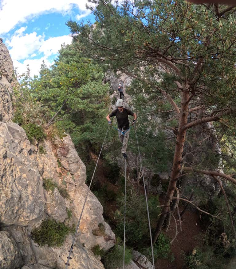 ¡Pero no se acaba ahí! Ahora que habremos aprendido las principales técnicas, una caminata de unos 10 minutos nos llevará al último tramo de la vía ferrata Roques de l'Empalomar. Evitaremos así la parte más complicada (una pared de 130 metros), pero nos quedaremos con toda la diversión: una travesía lateral y un puente de 12 metros que nos dejarán con el mejor sabor de boca posible.