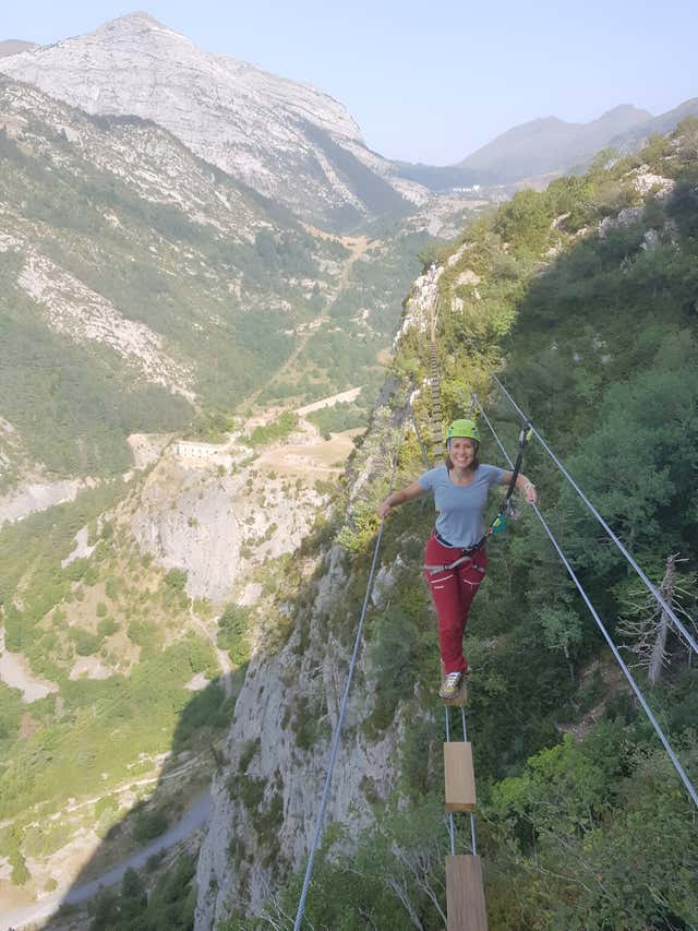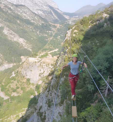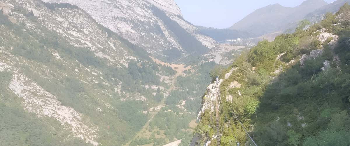 Nos enfrentaremos a un recorrido vertical de 410 metros, equipado con grapas y diferentes pasos aéreos que harán subir la adrenalina (si te tiemblan un poco las piernas, es normal. Eres humano). Superaremos una impresionante escalera de 25 metros que nos ayudará a vencer un desplome, cruzaremos un puente mono de 8 metros, nos balancearemos en un péndulo horizontal y, como plato fuerte, atravesaremos un puente tibetano de 80 metros suspendido entre las paredes.