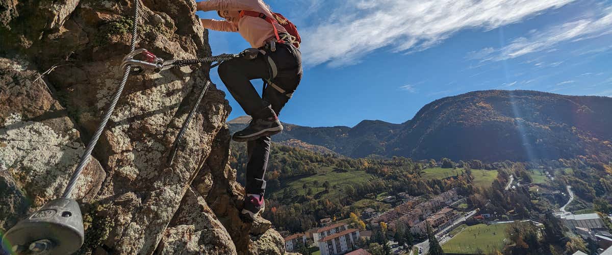 Durante el ascenso pasaremos por puentes tibetanos, pequeños desplomes y secciones colgantes que le dan a esta aventura ese toque emocionante sin dejar de ser accesible para todos. Una vez en la cima, llegaremos a la cresta y recorreremos un tramo más horizontal, muy panorámico, donde tendremos tiempo para relajarnos, sacar fotos y admirar las vistas increíbles de la Vall de Ribes y los picos del Pirineo Oriental.