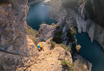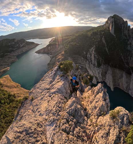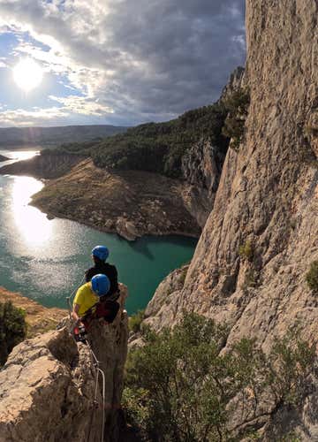 Iremos progresando por un espolón rocoso bien equipado, con grapas, presas y escaleras, siempre con cable de vida. Subiremos por pasos sencillos, pero emocionantes, mientras el embalse de Canelles se abre a nuestros pies y el Congost de Mont-Rebei se muestra en todo su esplendor.