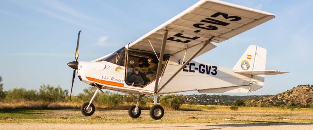 Volarás en un ultraligero biplaza Sky Ranger con dobles mandos y cabina completamente transparente.