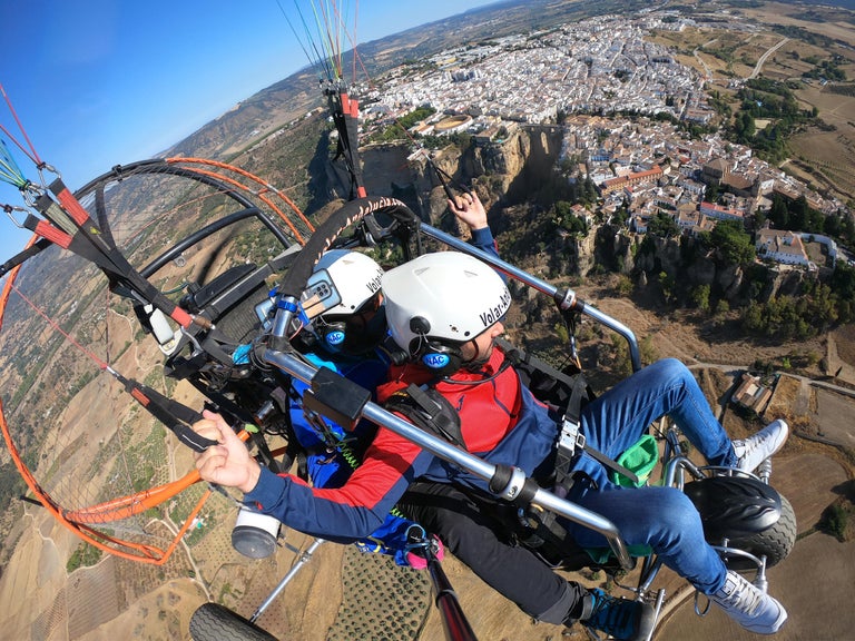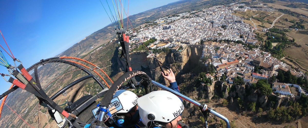 Descúbrelo con un vuelo en paramotor biplaza en Ronda. Sobrevuela el icónico Puente Nuevo y las murallas medievales durante 15, 30 o 40 minutos. Disfrutarás de la comodidad de un paramotor junto a un piloto experto.