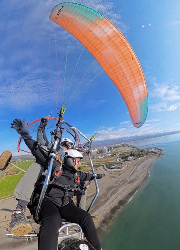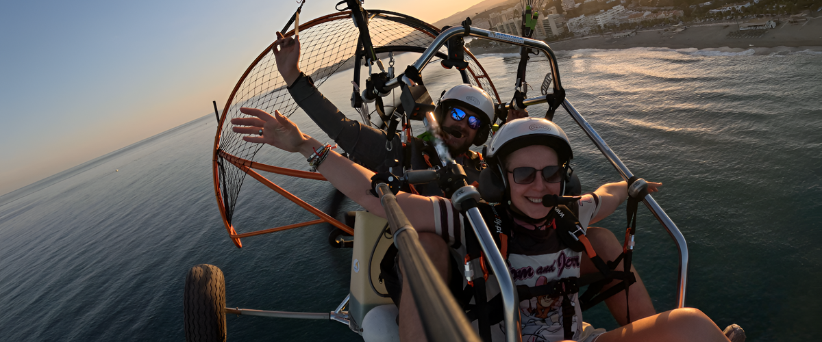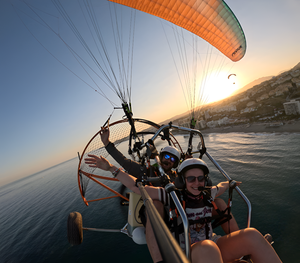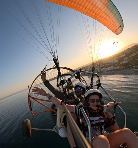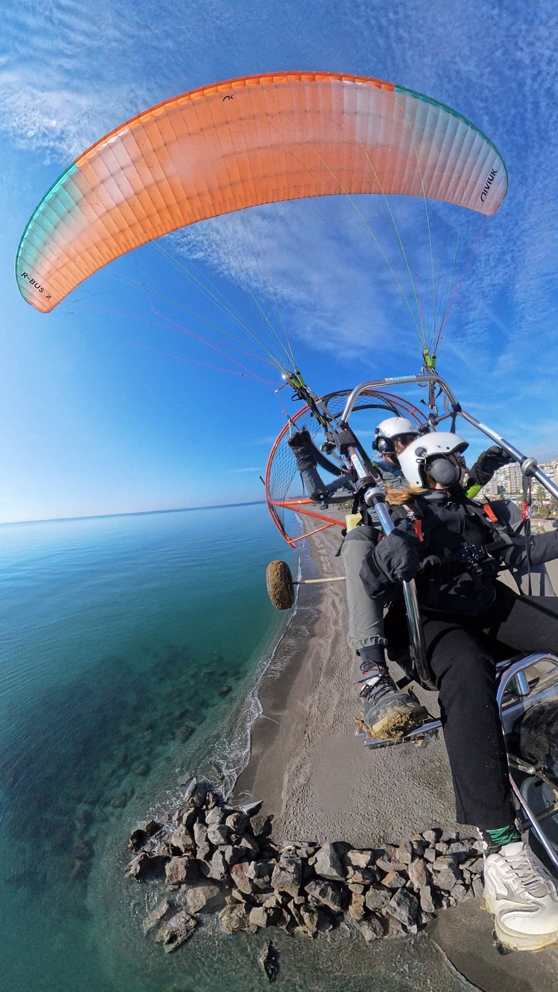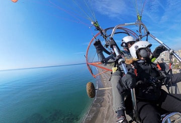 Despega en paramotor biplaza en Torre del Mar y sobrevuela durante 15 o 30 minutos la línea de playa, el puerto deportivo y los campos de golf de la Axarquía junto a un piloto profesional.