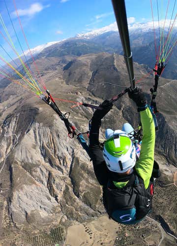 Volaremos durante 25 o 40 minutos y podremos alcanzar unos 1300 metros de altura, incluso 1600 o 1700 en los vuelos más largo. Disfrutaremos como niños contemplando los valles de Cenes de la Vega y Monachil, mientras vemos a lo lejos la Sierra Nevada y la ciudad de Granada. Si las corrientes térmicas lo permiten, será posible subir un poco más para tener una perspectiva más amplia, hasta El Veleta, la Alcazaba y el Mulhacén.