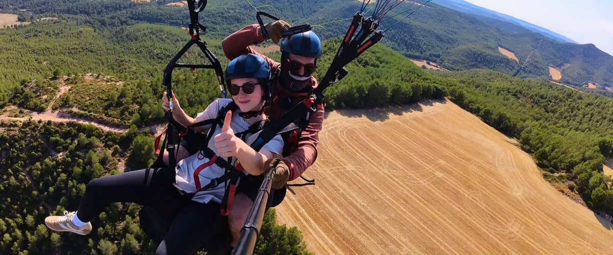 Tras la preparación, una pequeña carrera coordinada con el piloto y… ¡A volar! Dependiendo de la opción elegida en la reserva, disfrutaremos de un vuelo de 5-8 minutos o de 20-25 minutos. Todo ello sobre un paisaje amplio y abierto, con Montserrat al fondo y la Conca d'Òdena desplegándose bajo los pies. Y si las condiciones lo permiten y lo solicitamos, podremos incluso tomar los mandos durante unos instantes.