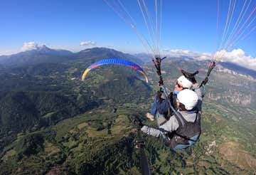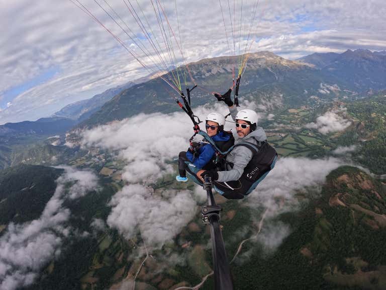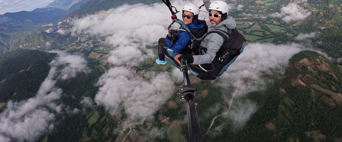 Vive la emoción única de volar participando en un vuelo en parapente biplaza en Castejón de Sos: acompañado por un piloto profesional, despegarás sobre el valle de Benasque con vistas a las cumbres más altas de los Pirineos.