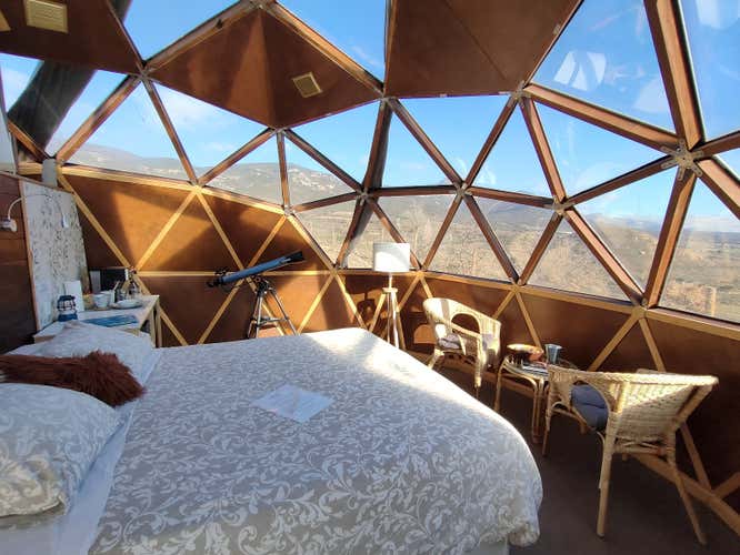 A los pies de la Sierra de Caballera, entre montañas y calma, os espera una experiencia pensada para mirar las estrellas sin prisas. Dormiréis con todas las comodidades en un domo geodésico privado, con vistas al pueblo de Bolea, o el pico Gratal y la Hoya de Huesca. Un alojamiento ecológico y autosuficiente donde podréis brindar con vino local y mirar las estrellas con telescopio.