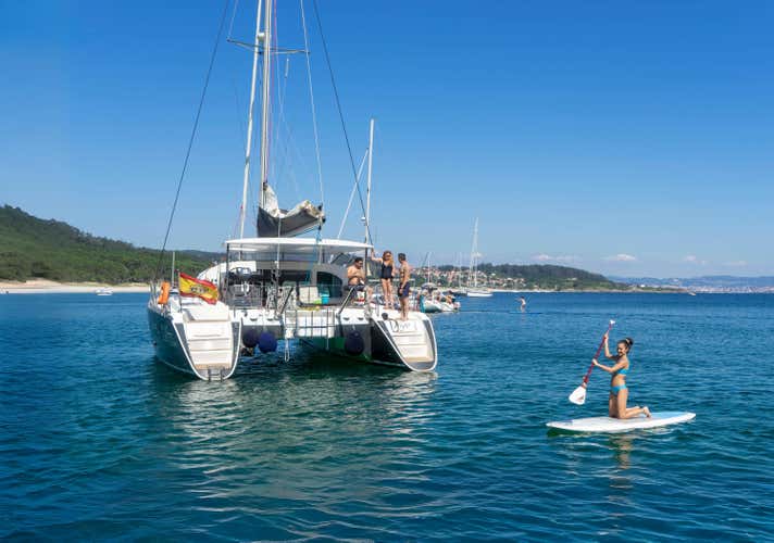 Ocho horas a bordo de un catamarán en la ría de Vigo dan para mucho. Y si el plan es flexible, mejor todavía. El patrón te ayudará a decidir la mejor ruta a bordo del catamarán Orión. Y entre baño y baño, si te apetece, podrás remar en paddle surf o simplemente relajarte disfrutando del entorno. Una jornada entera en el mar para cuidar cuerpo y mente, rodeados de naturaleza y buena compañía.