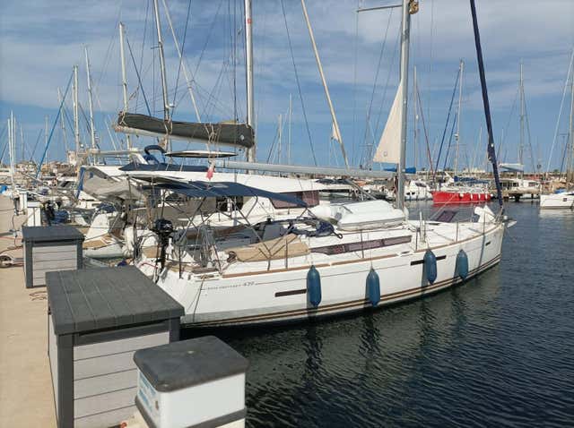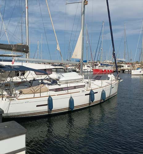 The boat is the Happy Day, model Sun Odyssey 43 with a length of 14 metres and a 55 hp engine. It has capacity for up to 11 participants and the skipper. It is fully equipped with interior/exterior loudspeakers, battery charger, kitchen, fridge, complete kitchenware, table in the saloon, hot water and 2 bathrooms with shower. Outside there is a cockpit with teak seats, hot/cold shower, bathing platform with ladder, folding table, bimini and sprayhood.