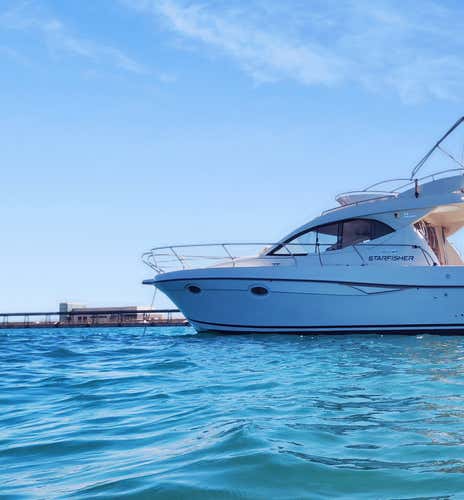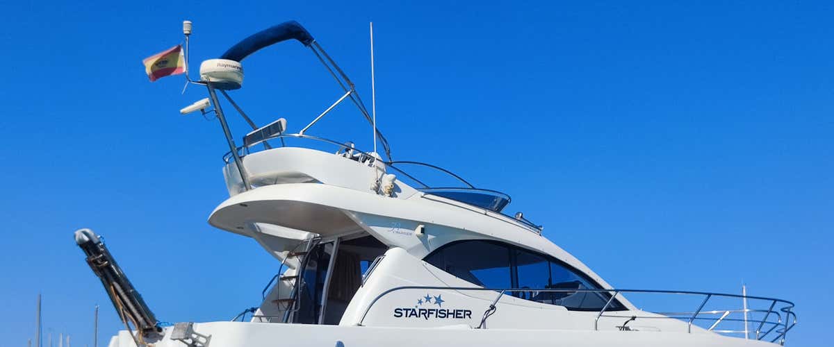 The boat is a Starfisher 34 yacht with a length of 11.3 metres and 250 hp. It has a capacity for 9 people and is equipped with a fly bridge, which allows a 360º panoramic view from the top of the boat. It has 2 cabins, 1 bathroom and has all kinds of services.