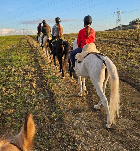 Enjoy a 1-hour equestrian immersion on the Aljarafe hillside, where you'll ride along natural trails on the back of recovered horses in an atmosphere of respect and freedom. Accompanied by expert guides and an exclusive audio guide for your mobile phone, you will discover the local fauna and the best views of Camas, culminating the experience with the option of visiting the stable to get to know the rest of the animal family up close.