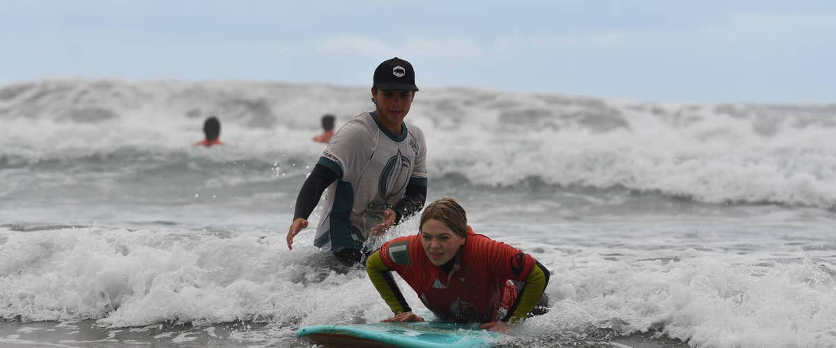 And now... Into the water! You'll put everything you've learnt into practice under the watchful eye of the instructor, who will correct you, encourage you and celebrate each attempt. You might fall, but when you catch your first good wave... you will want to do it again and again.