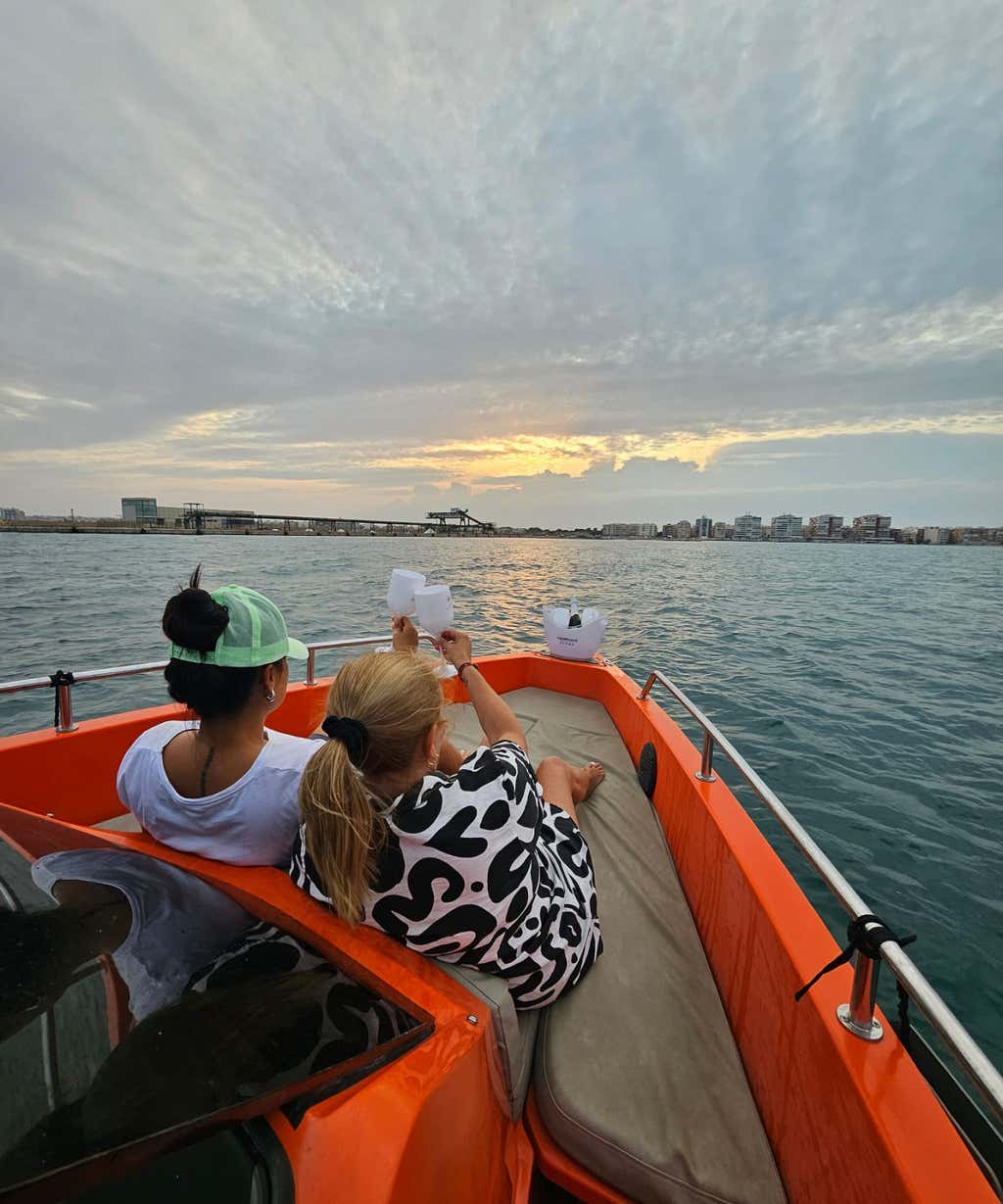 You will start the crossing leaving the port of Torrevieja towards Playa de los Náufragos, in the direction of Punta Prima. We will anchor in one of the two places to make a stop. You can take a swim while the sun goes down behind the horizon or toast with a glass of cava watching how everything turns red and gold.