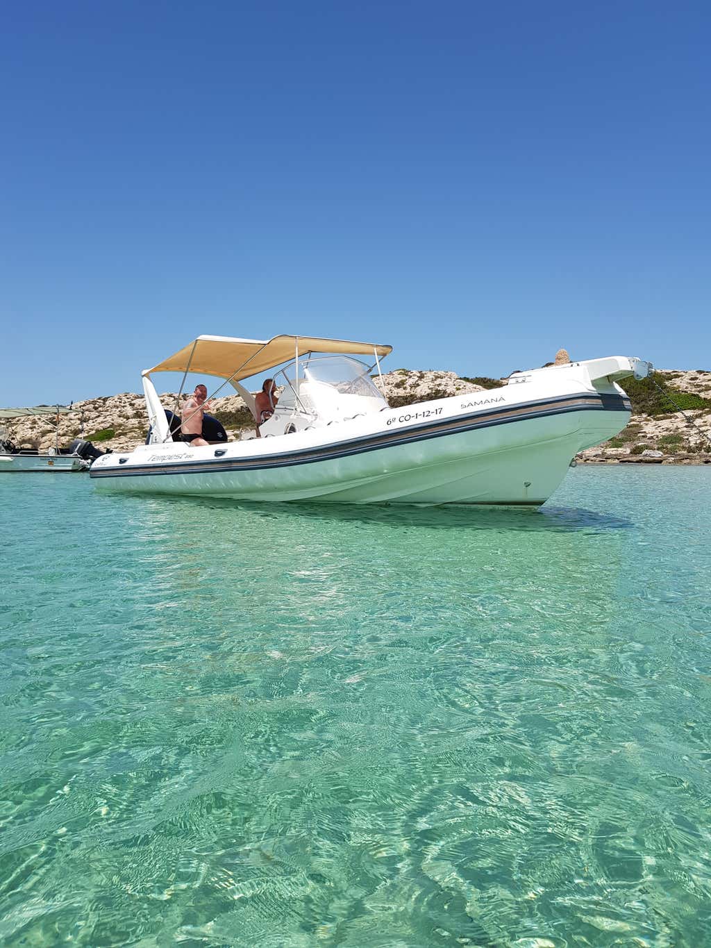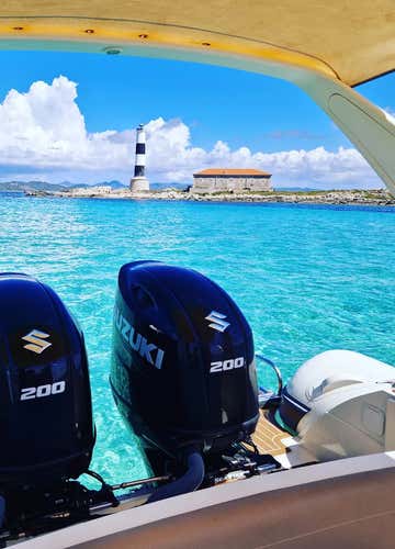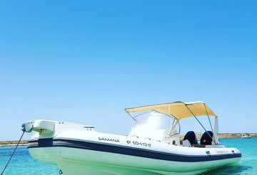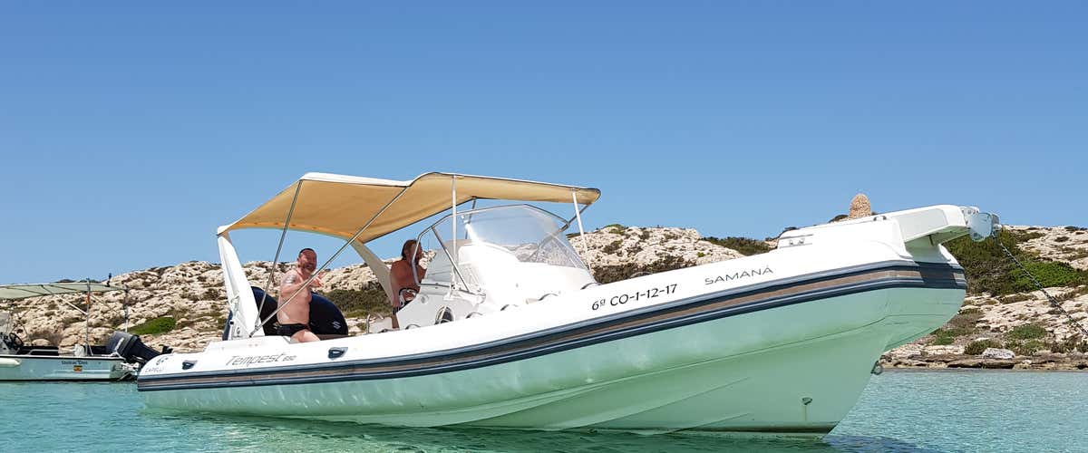 We will depart on board the semi-rigid motorboat Samaná, a Capelli 850 Tempest, with capacity for up to 12 people plus the skipper. We will sail along the south of the island of Ibiza, visiting spectacular coves and beaches: Ses Salines, Playa des Jondal, Porroig, Cala d'Hort and the impressive view of Es Vedrà.