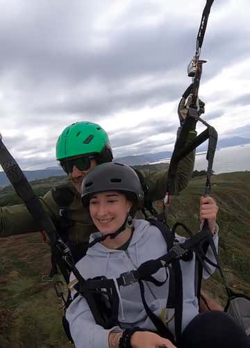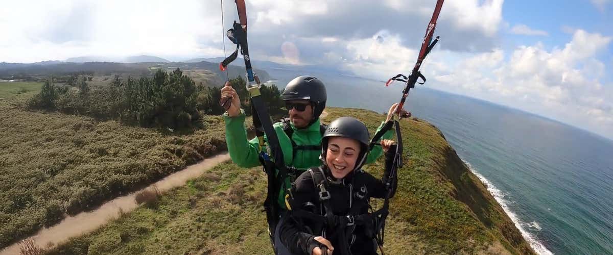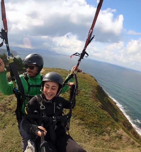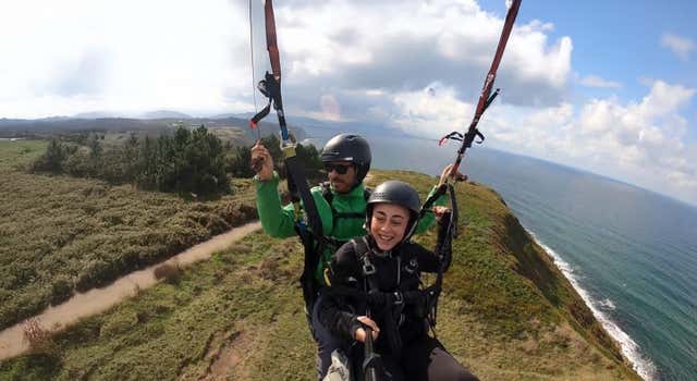 The best thing about this experience is that 2 people will fly simultaneously, each with their own professional pilot, sharing the sky and the excitement. The gliders are held so close that we can see each other, smile at each other and even talk (loudly) to each other. It's an incredible feeling: floating together over the sea, just a few metres apart, while the wind carries us over a landscape that looks as if it has been painted.