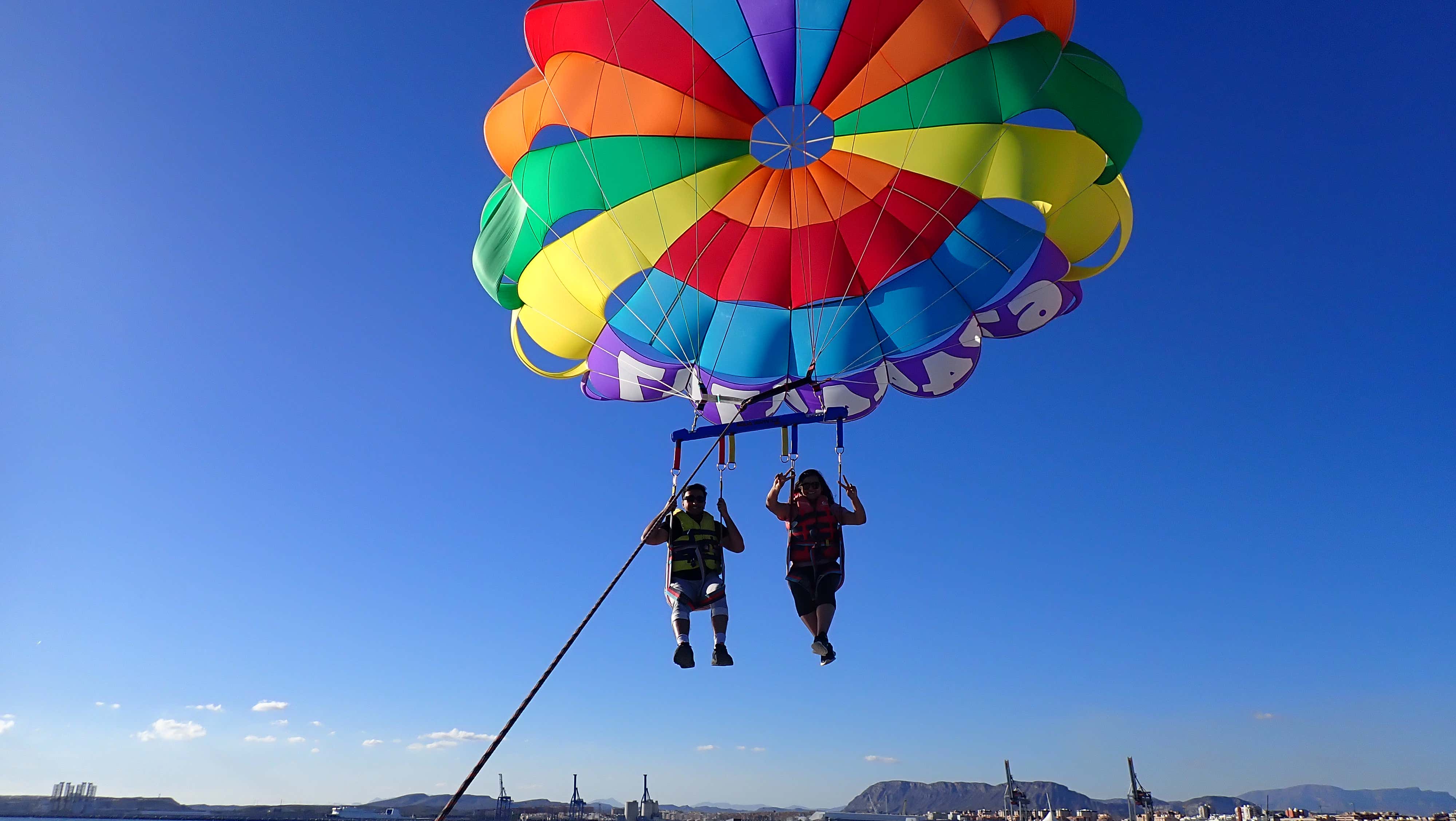 ¡Calma! Sabemos que antes de reservar tu próxima ruta en parasailing en Alicante necesitas más información. Comenzamos por lo más básico: ¿en qué consiste el parasailing? Pues en montarte en una embarcación a motor, en ponerte un arnés conectado a un paracaídas y a una cuerda y en volar en paracaídas sobre el mar.